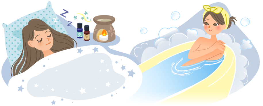 眠るためには安心できて心地がいいことが大切です。肌触りがいい寝具を選ぶ、好きな香りや音楽、ゆっくりお風呂を楽しむなど、寝る前に自分の頭と心をリラックスさせ、スイッチをオフにできるような習慣をみつけることもおすすめです。眠ろうとして頑張れば頑張るほど目がさえる、というケースもあります。眠れないときには、一旦ベッドを離れて気分転換を図るのもよいでしょう。