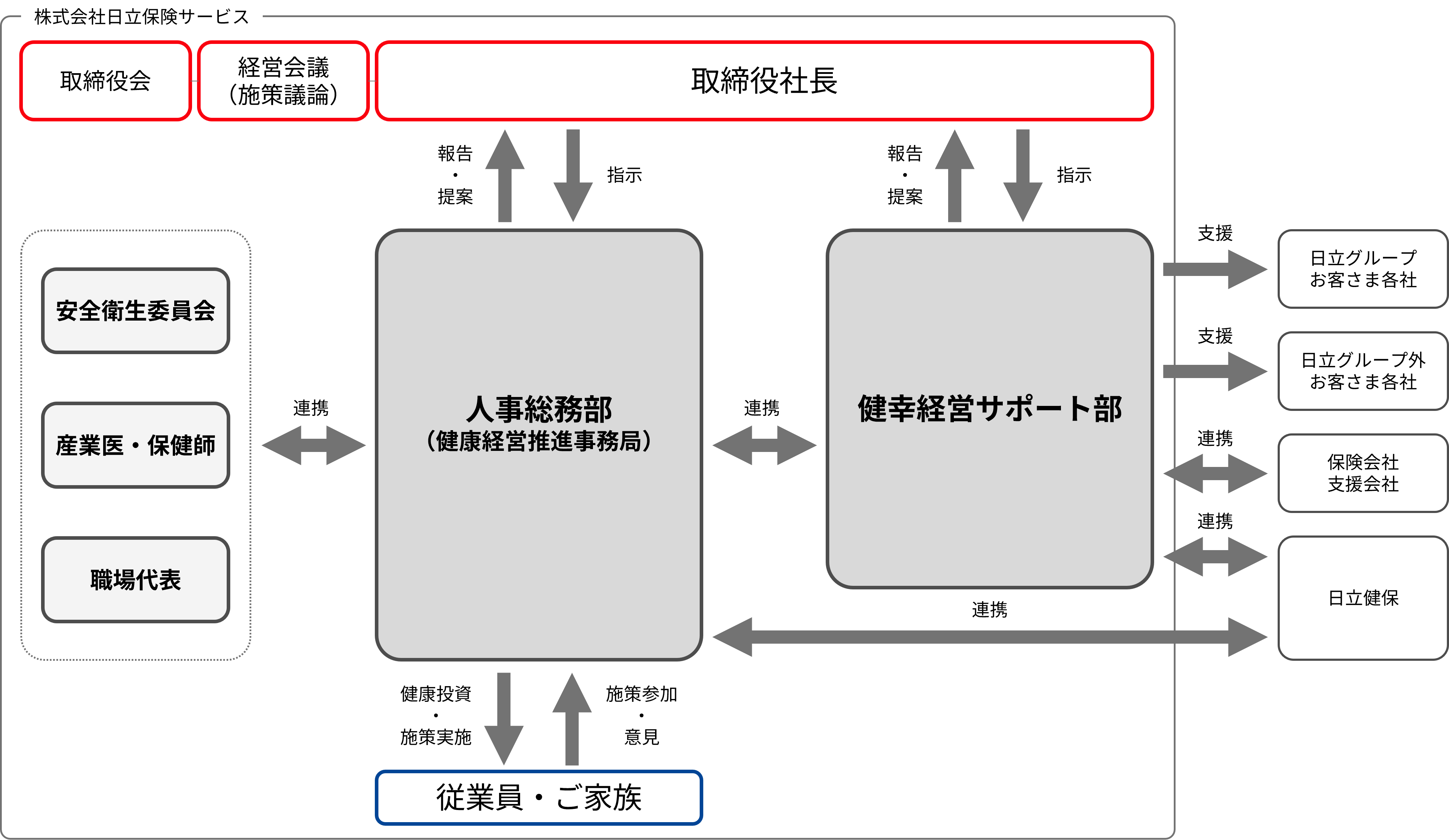 また、当社は日立グループの保険制度の運営を通じてグループ全体に「あんしんと安全」を提供する役割を担っています。こうした取り組みで培った知見を生かし、日立グループ以外のお客さまに対しても、健康経営の普及・支援に取り組んでいきます。