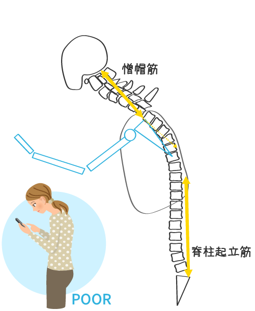 無意識のうちにスマートフォンを見ながら猫背になったり、足を前に出して背もたれに寄りかかったり、腰が反った状態で座っていないでしょうか。こうした姿勢を続けていると、座っているだけで肩や腰に負担がかかります。肩の僧帽筋(そうぼうきん)や肩甲骨(けんこうこつ)周辺の負担が大きいと肩こりや肩関節周囲炎(五十肩)につながります。背中だけでなく腰も丸まってくると背骨を支える脊柱起立筋(せきちゅうきりつきん)に負担がかかり、腰痛につながりやすくなります。高齢になって筋力が弱くなれば胸椎が負荷を支えきれずに圧迫骨折を招くこともあります。